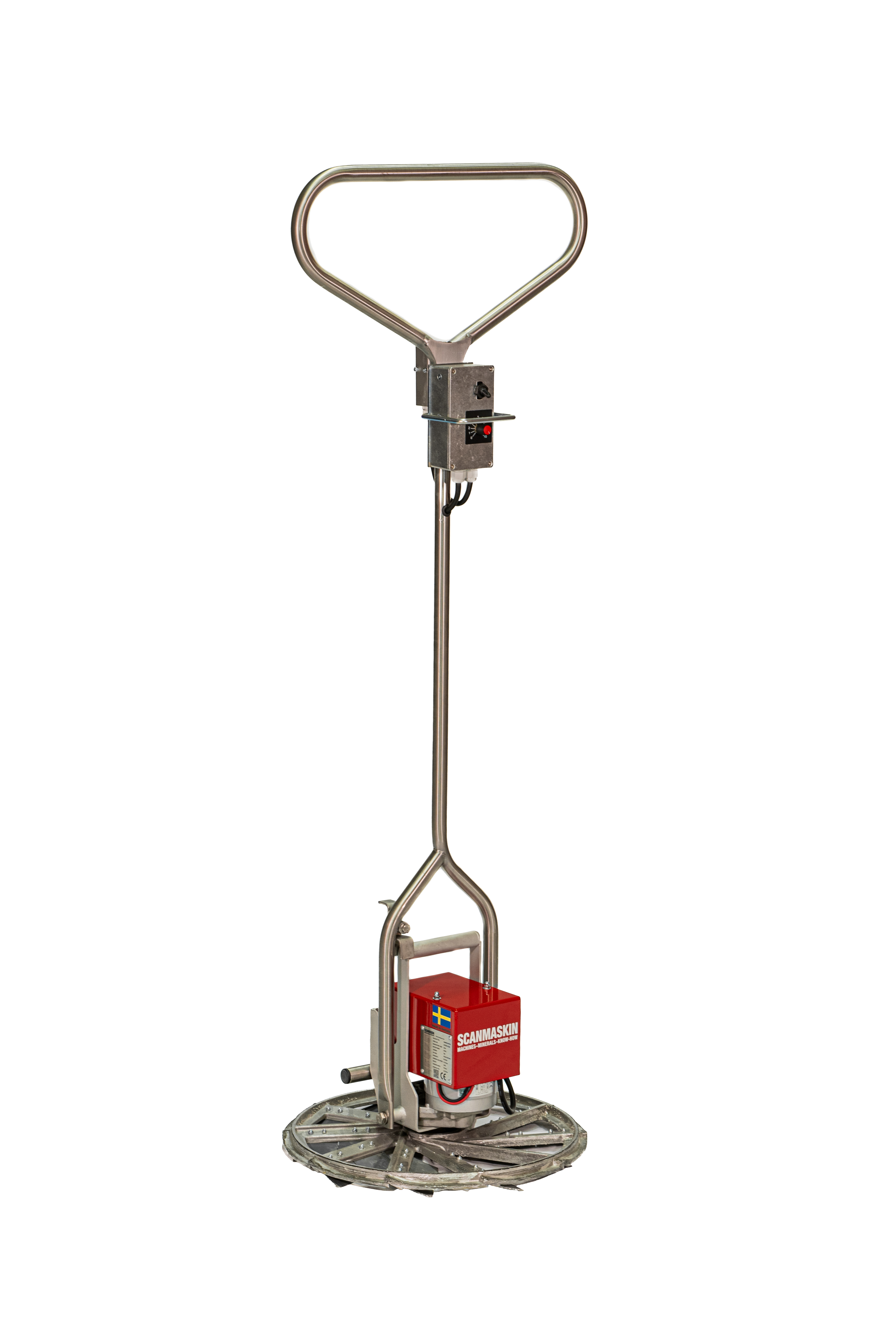 Ingår: Maskindel, styrhandtag, 1st glättningsskiva med diameter 500mm, 20st glättningsblad (monterade), av och påtagningsnyckel till glättningsskivan. 3st batteriryggsäckar med batterier och 2st laddare.